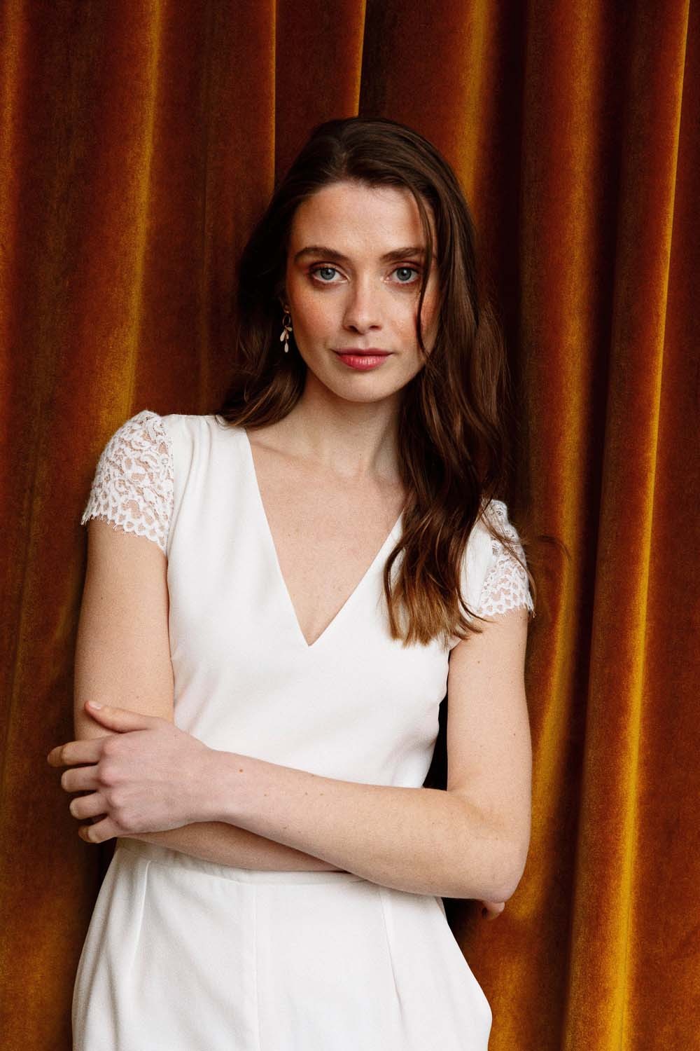 - Long jumpsuit in off-white crepe and lace