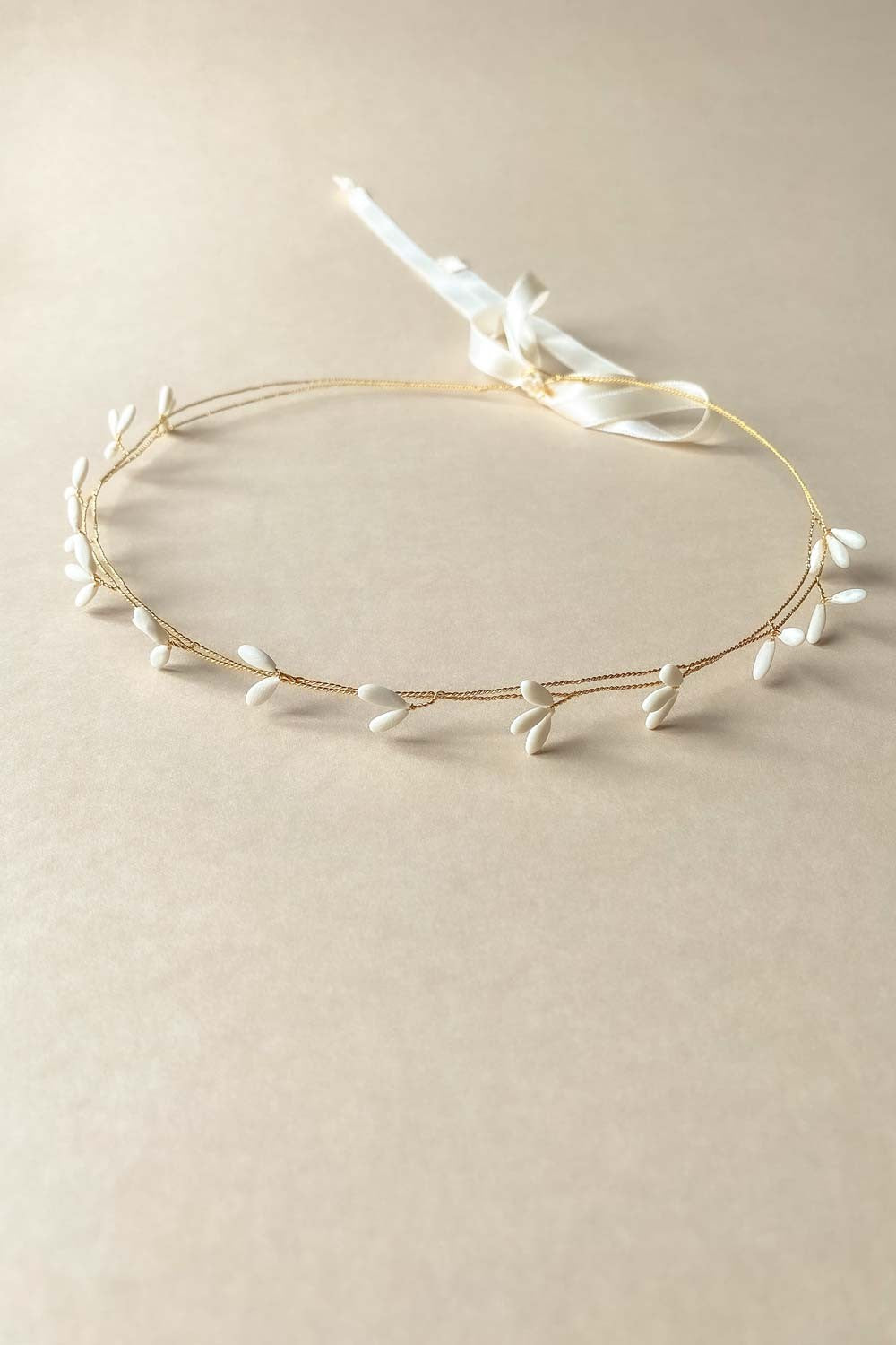 Demeter is a fine crown of white porcelain flowers, mounted on a gold-plated wire. Each branch is entirely handmade by the designer.
