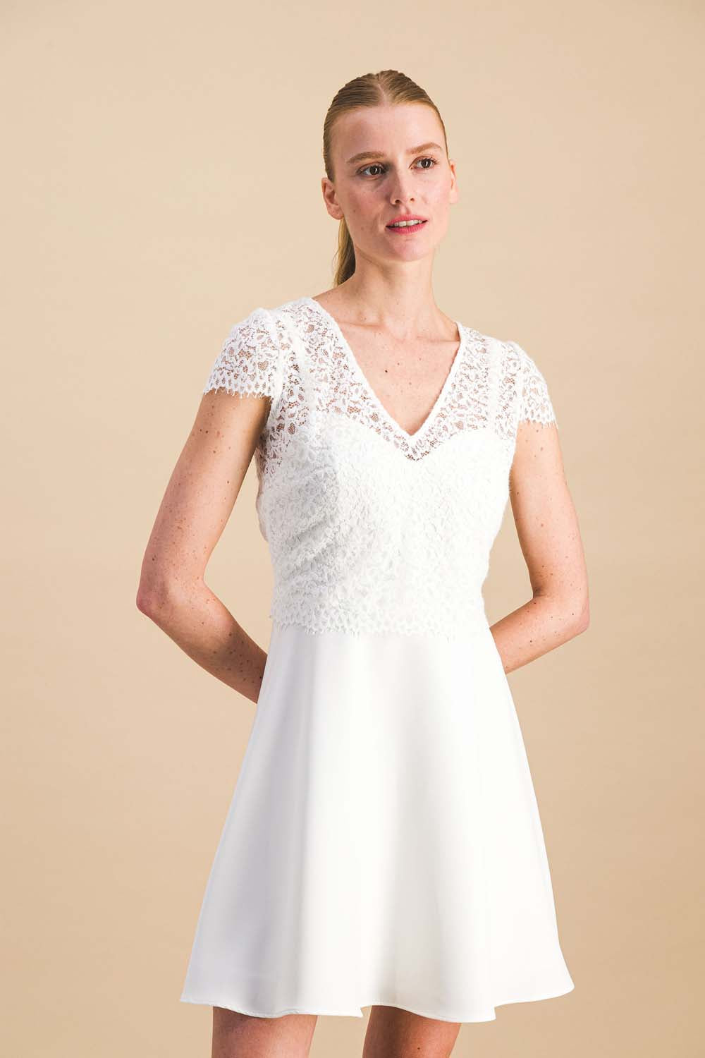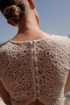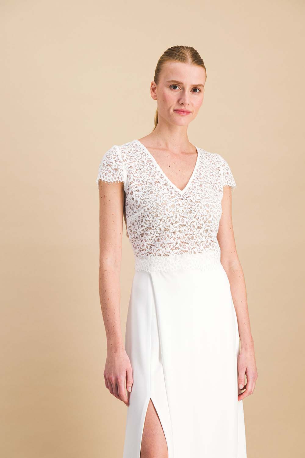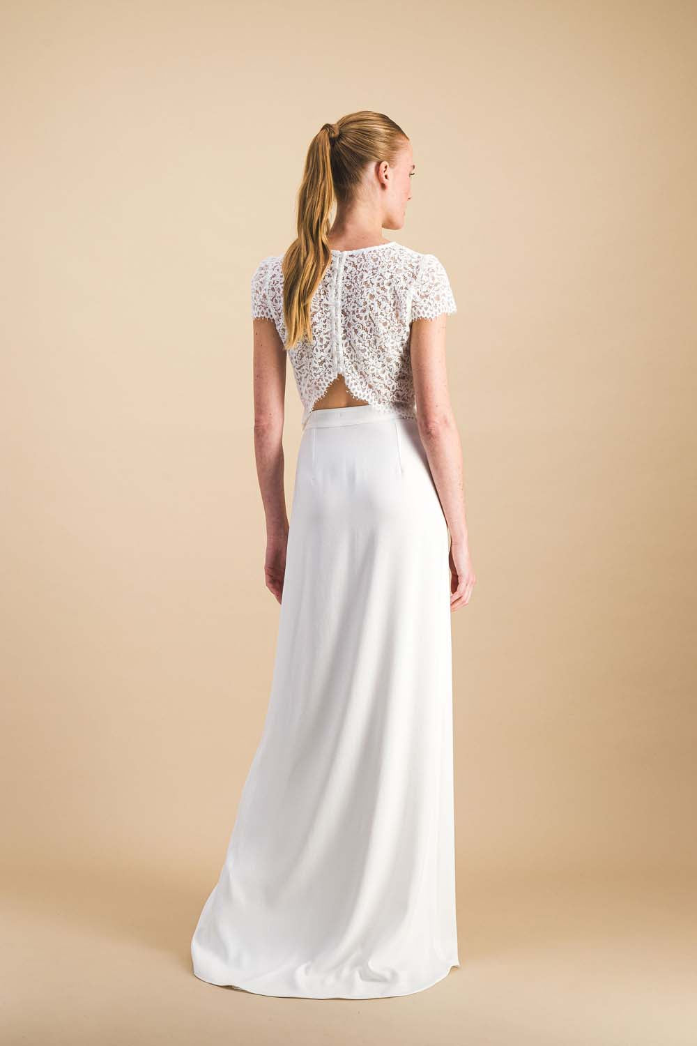 A lace top that is as modern as it is romantic for an elegant and daring bride.