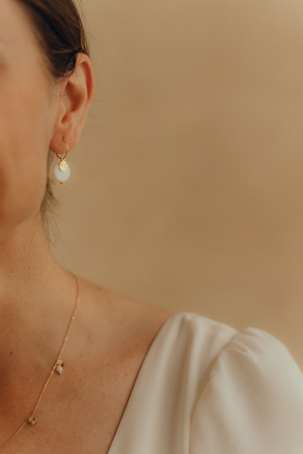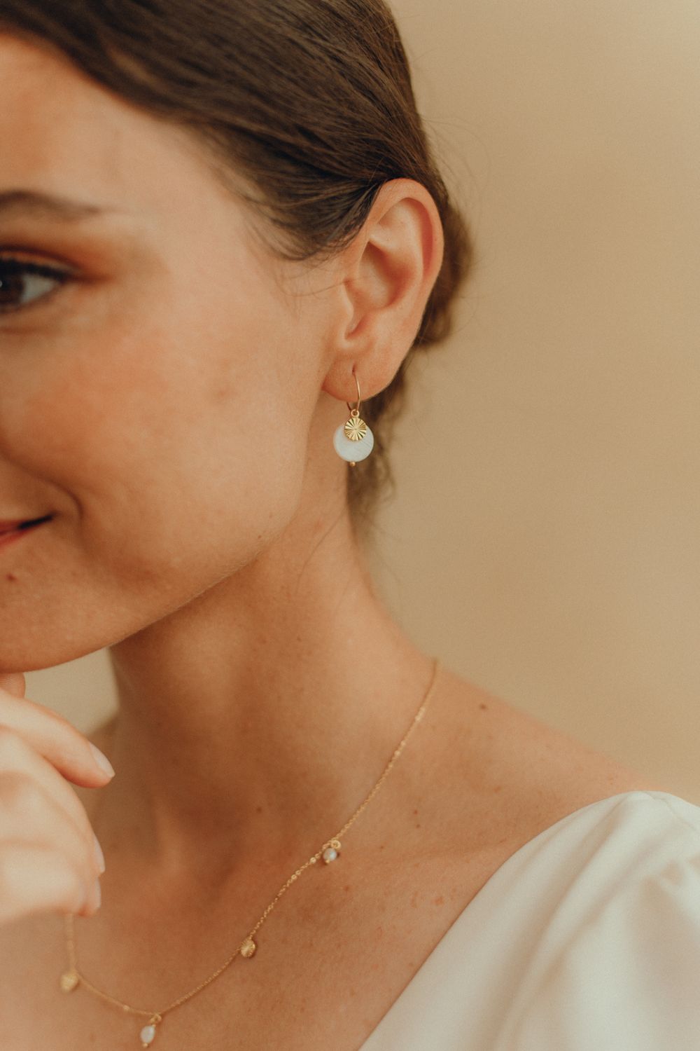 Sublimez votre look de mariée avec les boucles d’oreilles Flore, dorées à l’or fin 24 carats.