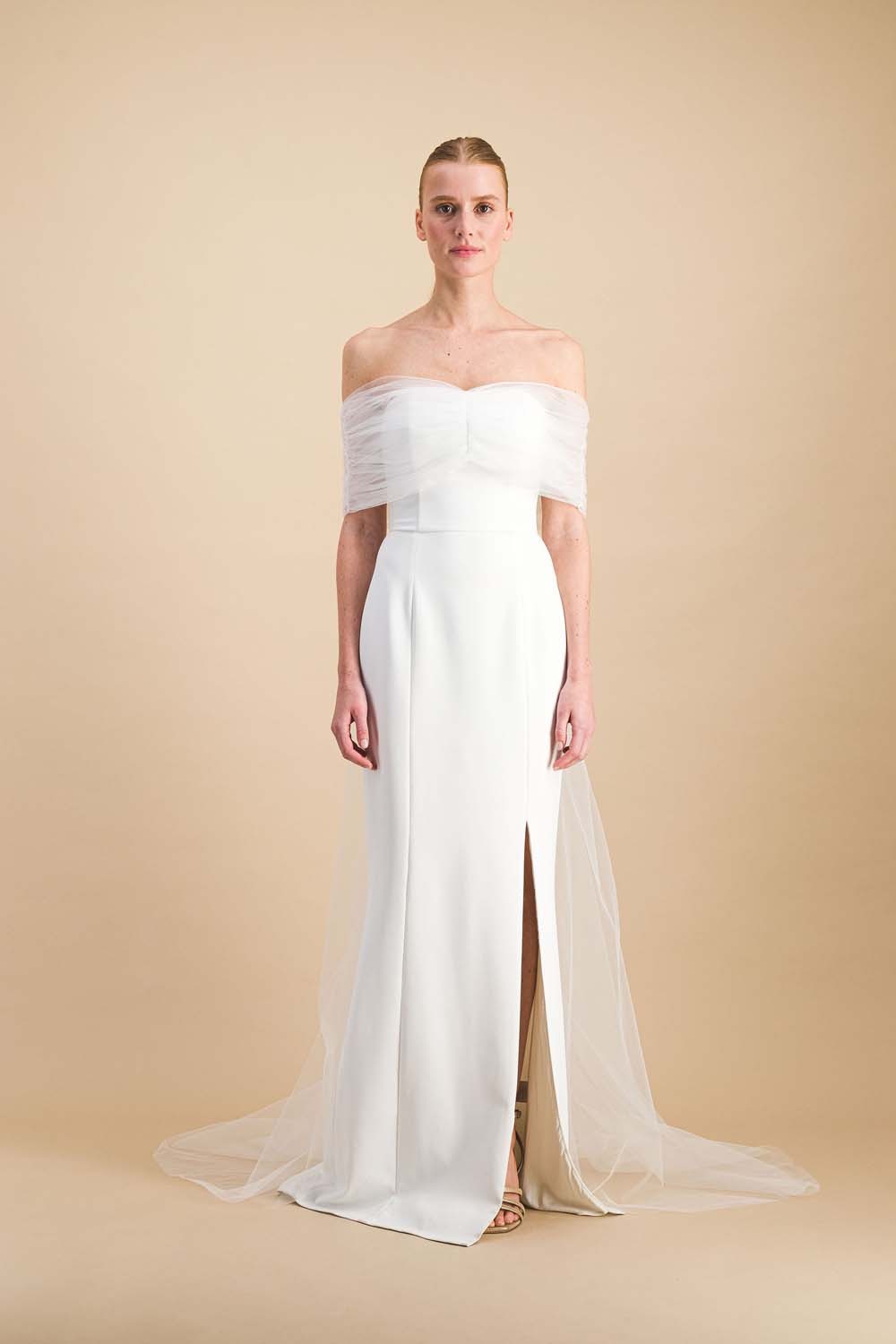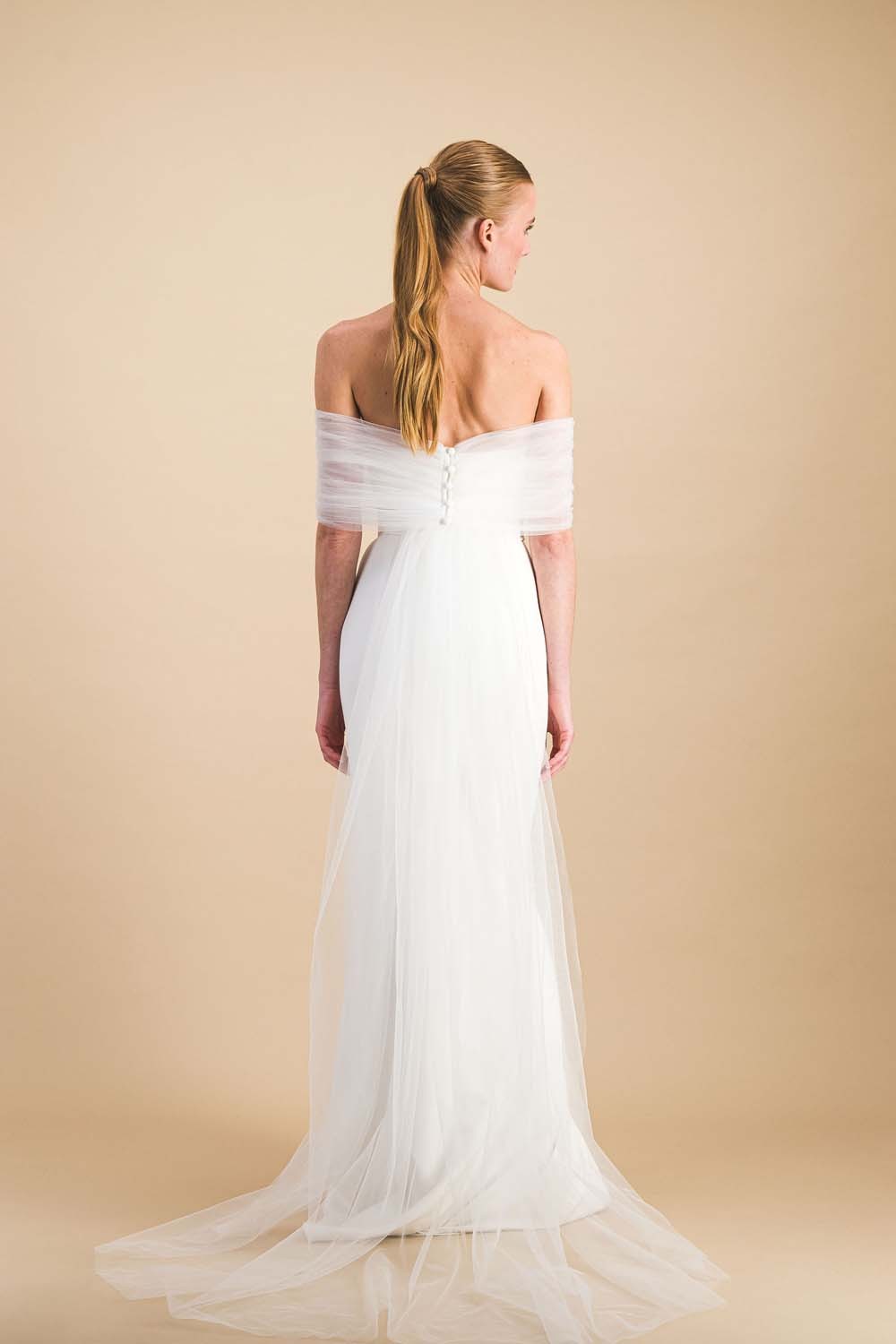Bustier avec traîne amovible, froncés en tulle blanc cassé