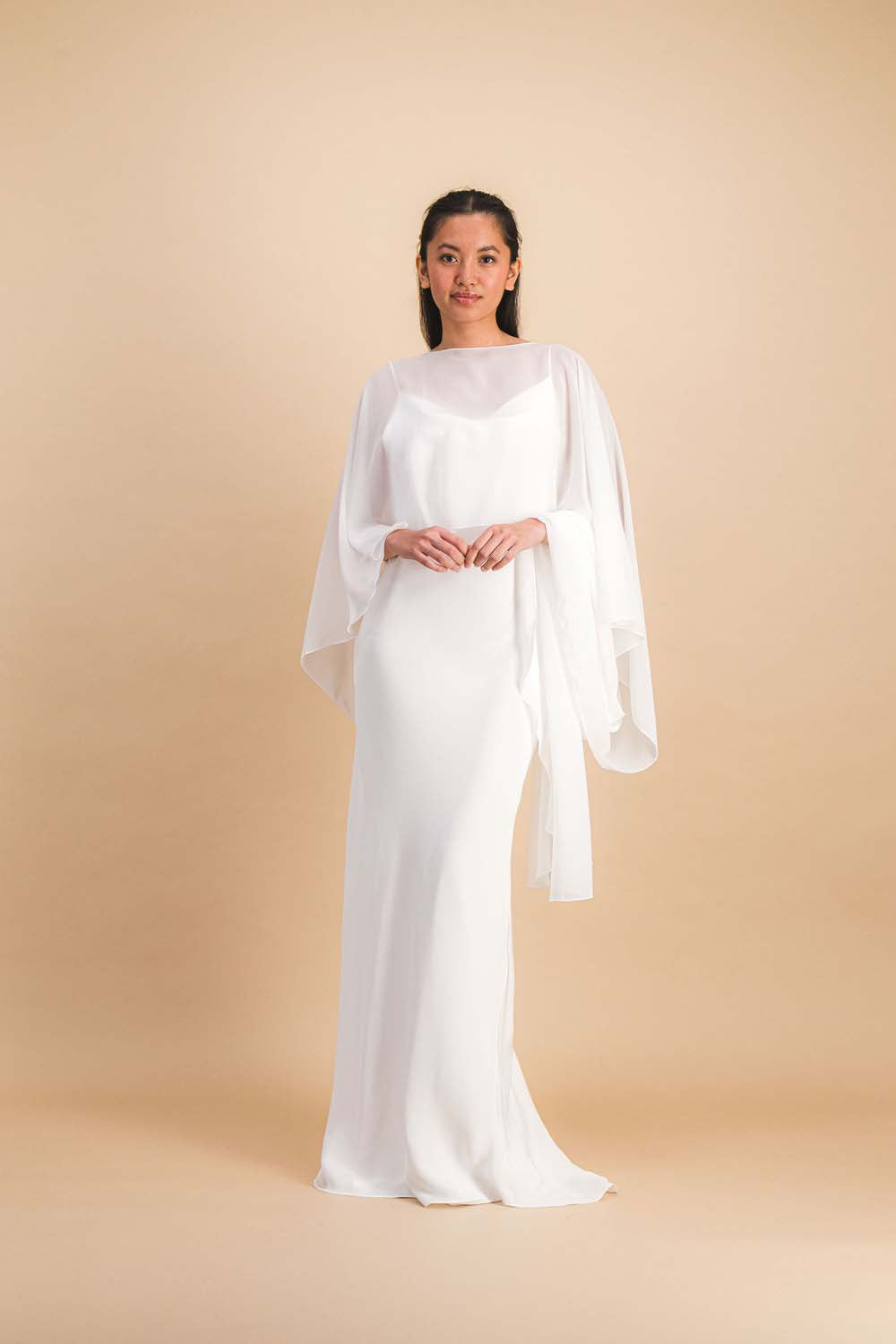 Paloma, la cape aérienne en mousseline qui sublime la mariée avec grâce et légèreté.