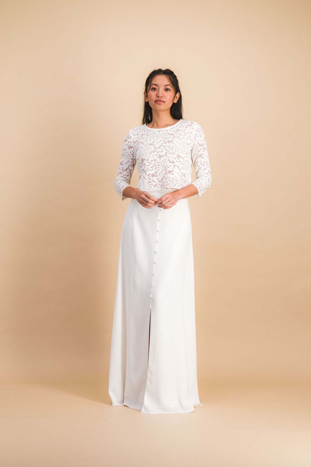Dentelle délicate et lignes romantiques : le haut Madeleine sublime la mariée avec une élégance intemporelle.