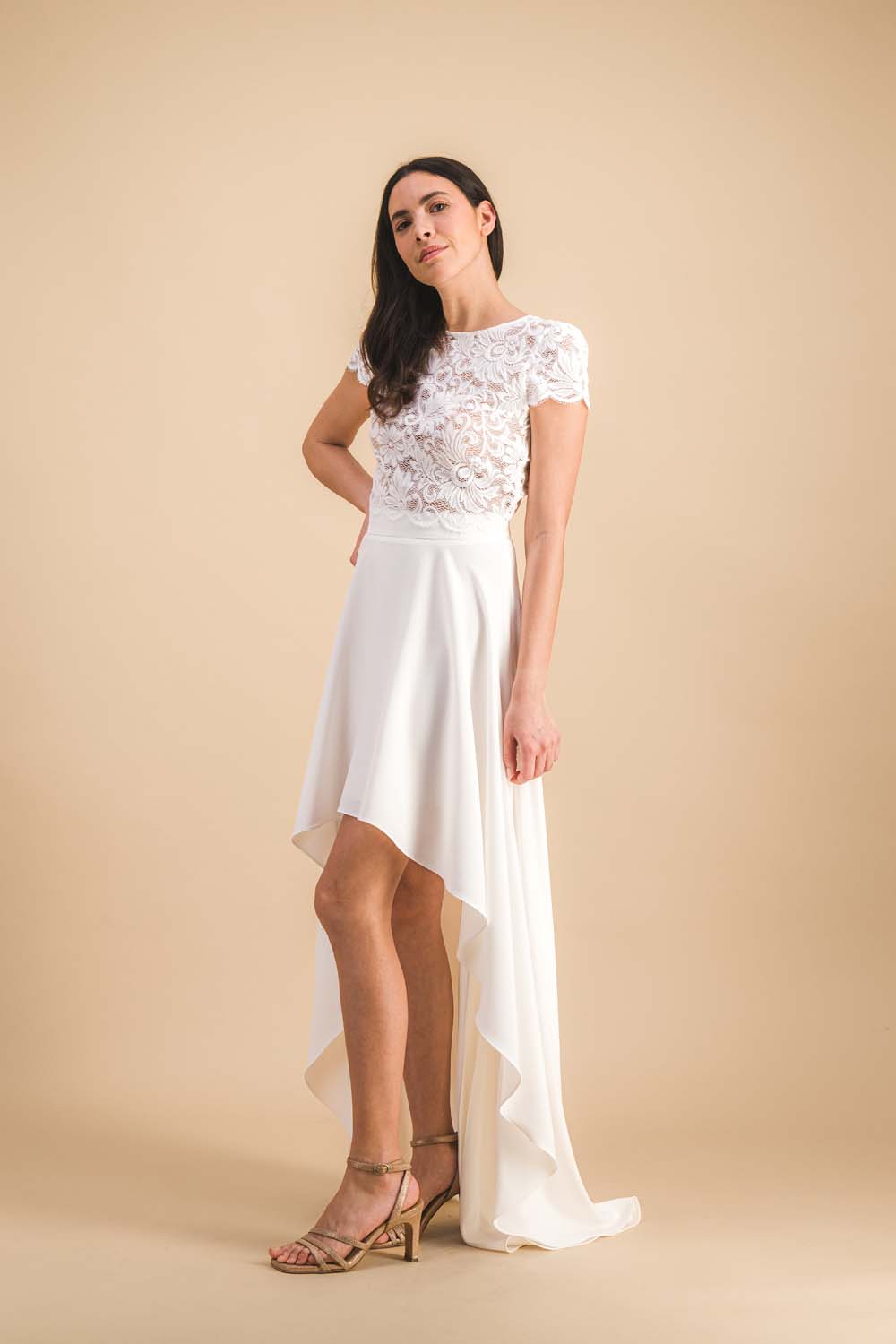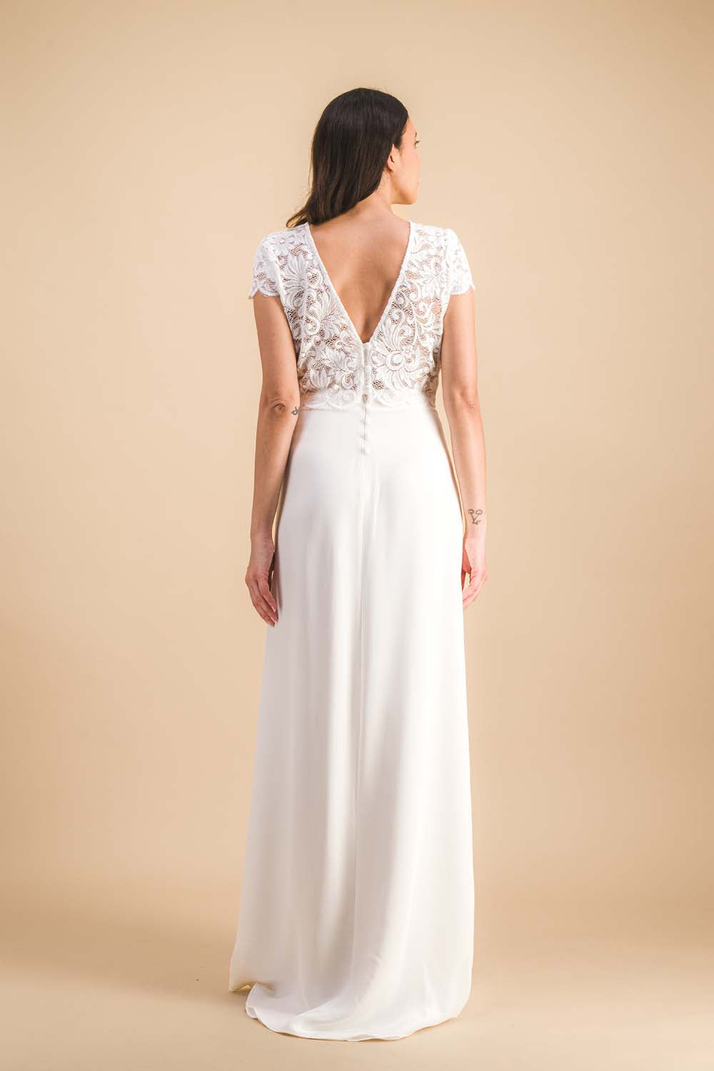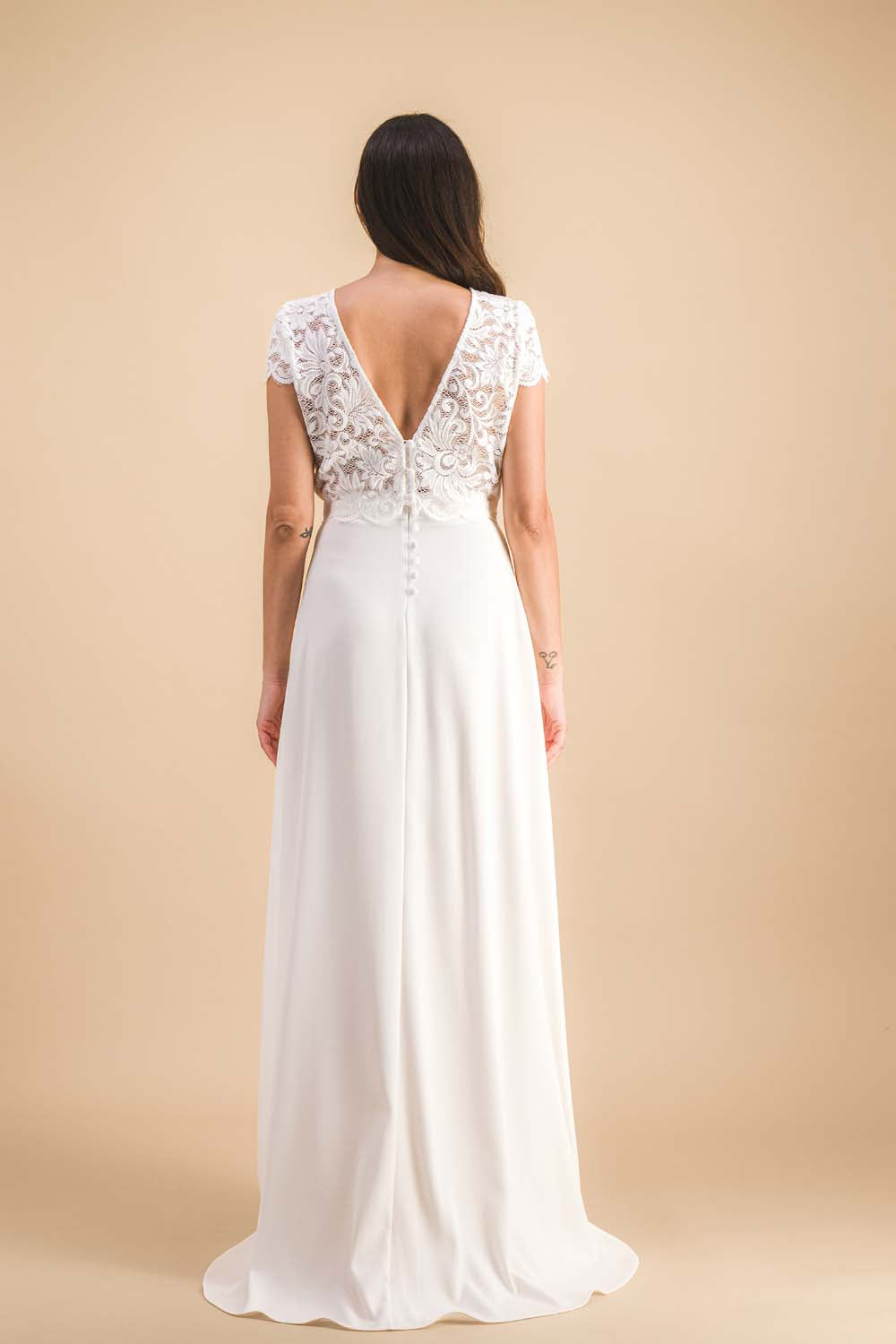 Paulina Lily, un haut de mariée en dentelle au dos subtilement dévoilé.