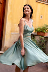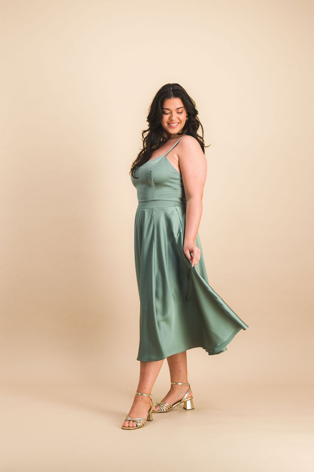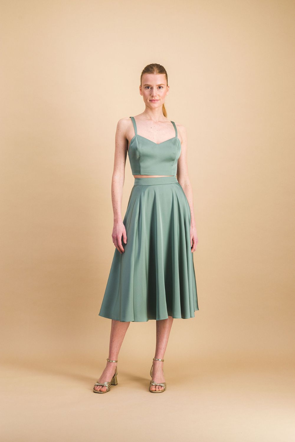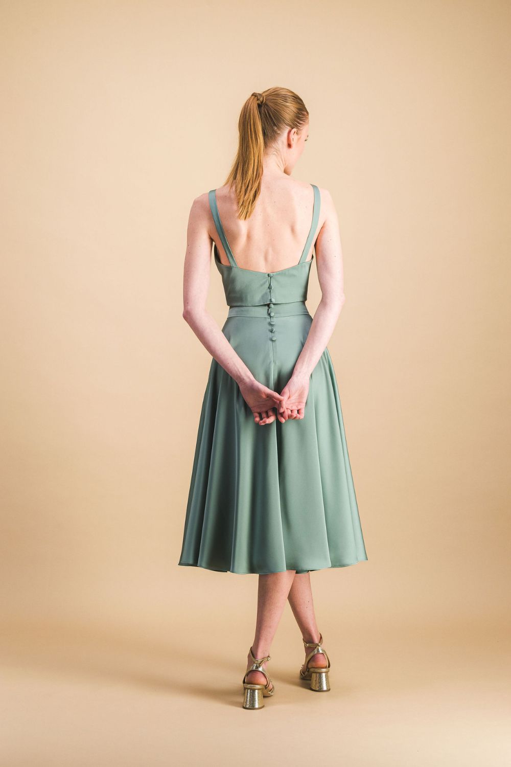 Élégance et fluidité avec la jupe Albertina en satin sauge. La jupe Albertina est la pièce idéale pour une tenue d’invitée sophistiquée.
