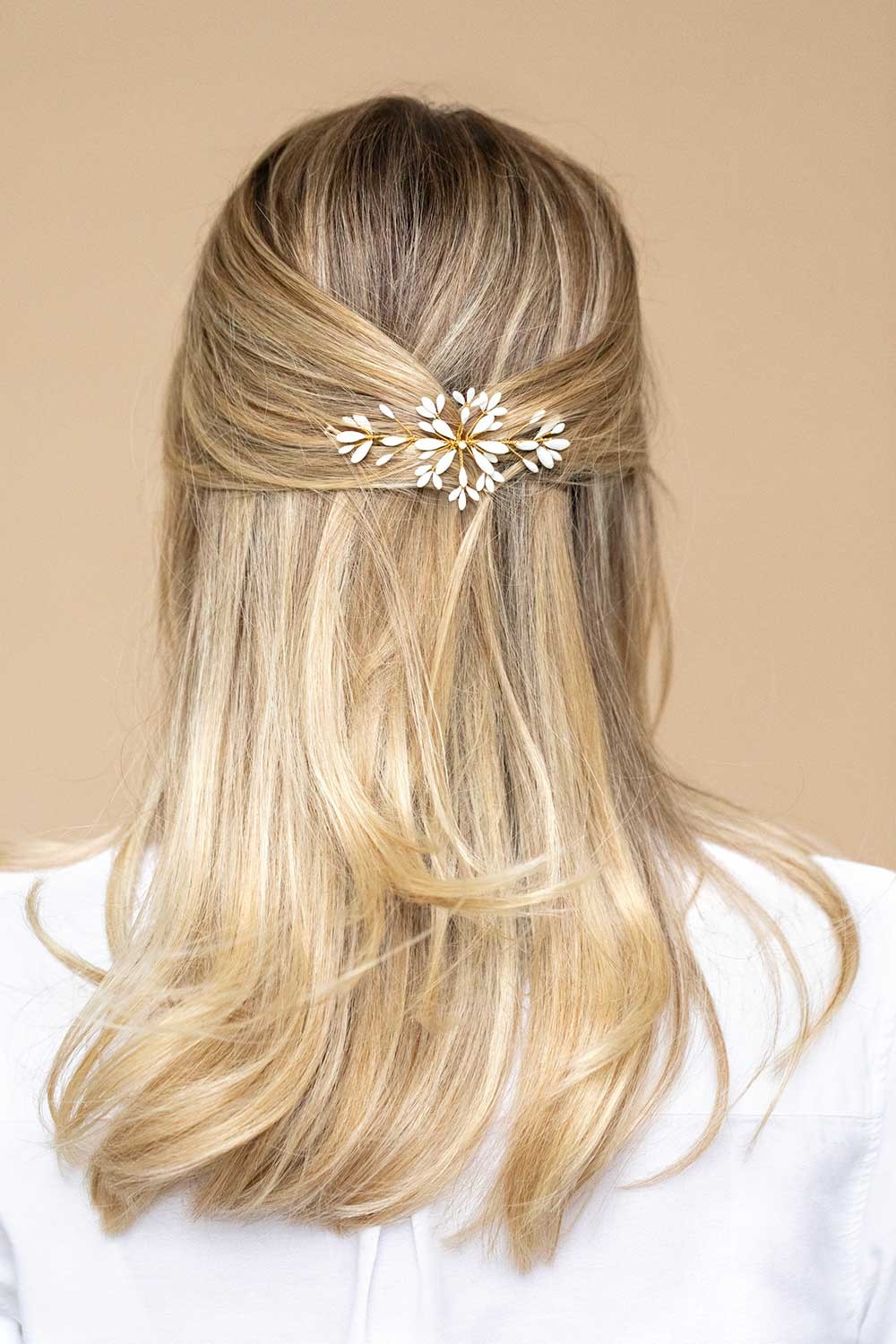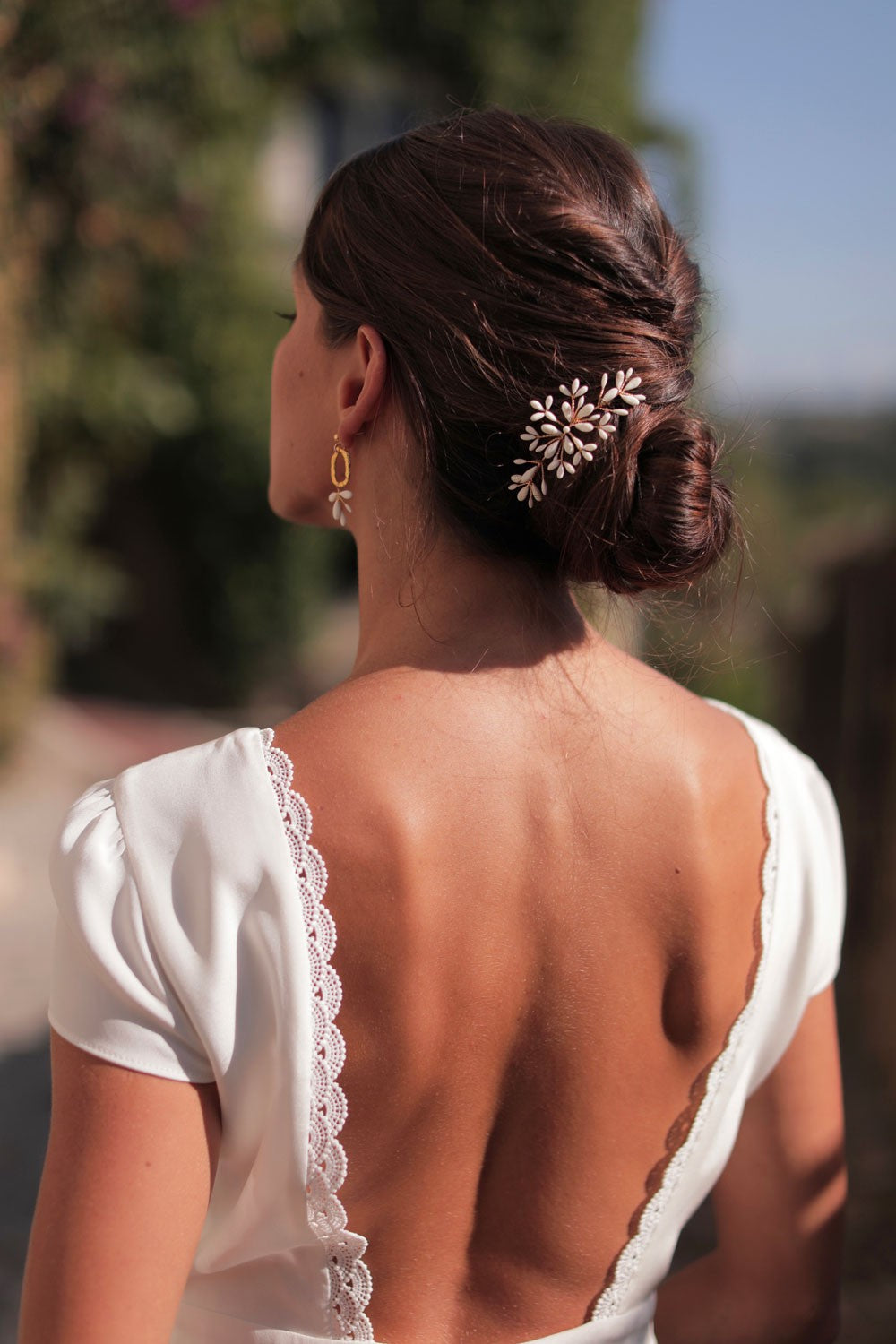 Clémentine est un peigne de porcelaine froide aux multiples détails monté sur un fil plaqué Or.