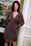 - Robe courte portefeuille en tulle plissé prune métallisé