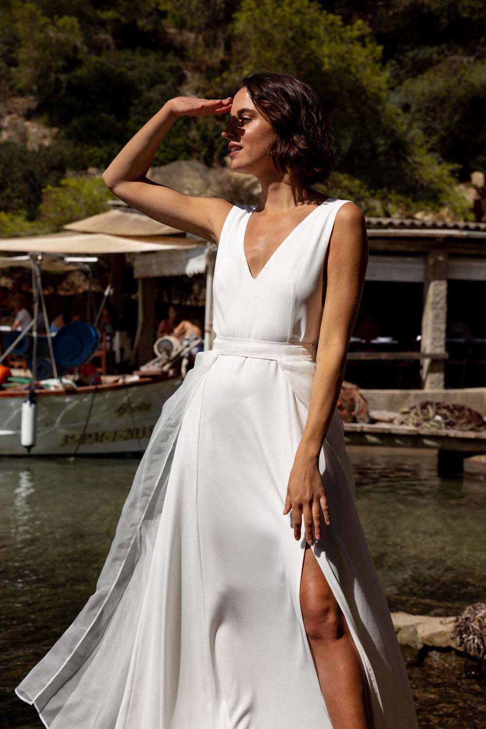 - Sur-jupe longue avec ouverture milieu devant et plis, en organza blanc cassé